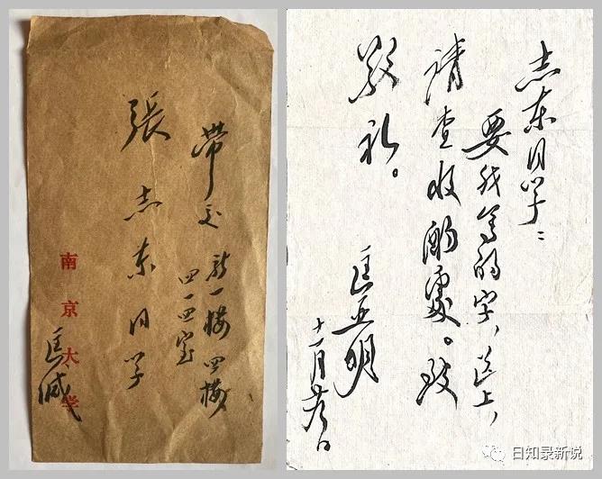 匡校长题词装在有南京大学题签的牛皮纸信封中,信封用毛笔字竖行写着:“带交:新一楼四楼四一四室张志东同学(匡缄)。”