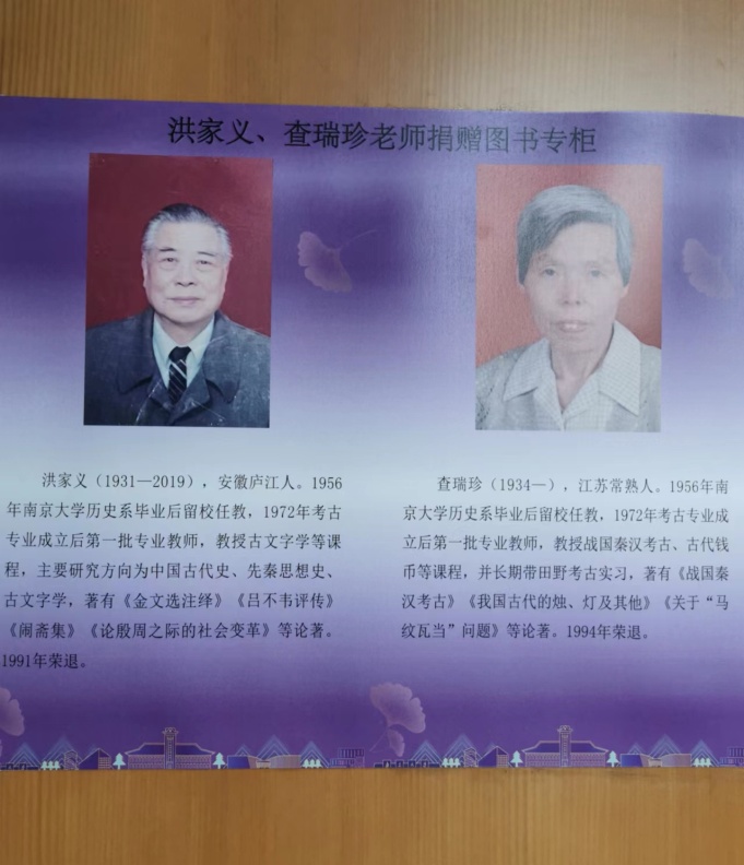 洪家义(1931-2019)和查瑞珍(1934一)伉俪同为南京大学历史系1952级本科生,1956年毕业后一同留校任教,1972年考古专业成立后同任第一批专业教师。洪家义先生教授古文字学等课程,主要研究方向为中国古代史、先秦思想史、古文字学,著有《金文选注绎》、《吕不韦评传》、《闹斋集》、《论殷周之际的社会变革》等论著。1991年荣退。查瑞珍老师教授战国秦汉考古、古代钱 币等课程,并长期带田野考古实习,著有《战国秦汉考古》、《我国古代的烛、灯及其他》、《关于“马纹瓦当”问题》等论著。1994年荣退。
