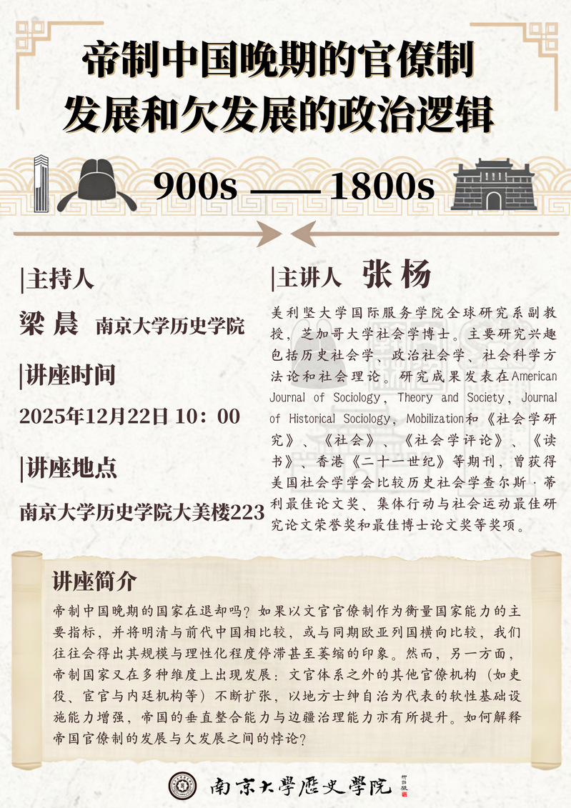 讲座预告 | 帝制中国晚期的官僚制发展和欠发展的政治逻辑(900s-1800s)