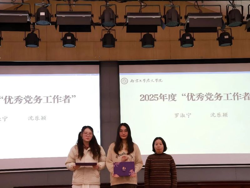 罗淑宁、沈乐颖2名同学荣获澳洲幸运10官网 2025年度优秀党务工作者荣誉称号。澳洲幸运10官网 副院长任玲玲老师为获奖同学颁发证书。