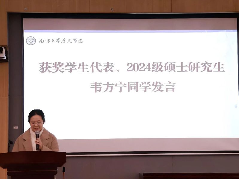 而后,获奖学生代表2022级本科生张益婷、2024级硕士研究生韦方宁分别作分享发言。张益婷同学回顾自身的求学经历,寄语同学们在探索中不断发现自我,勇敢前行。韦方宁同学则从历史学专业党员与研究生党支部书记的双重身份出发,分享学习实践中的思考与收获。