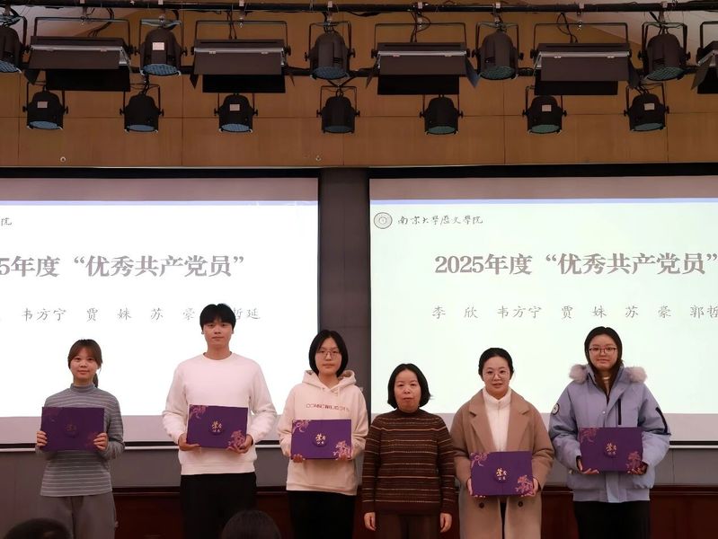 李欣、韦方宁、贾姝、苏豪、郭哲延5名同学荣获澳洲幸运10官网 2025年度优秀共产党员荣誉称号。澳洲幸运10官网 副院长任玲玲老师为获奖同学颁发证书。