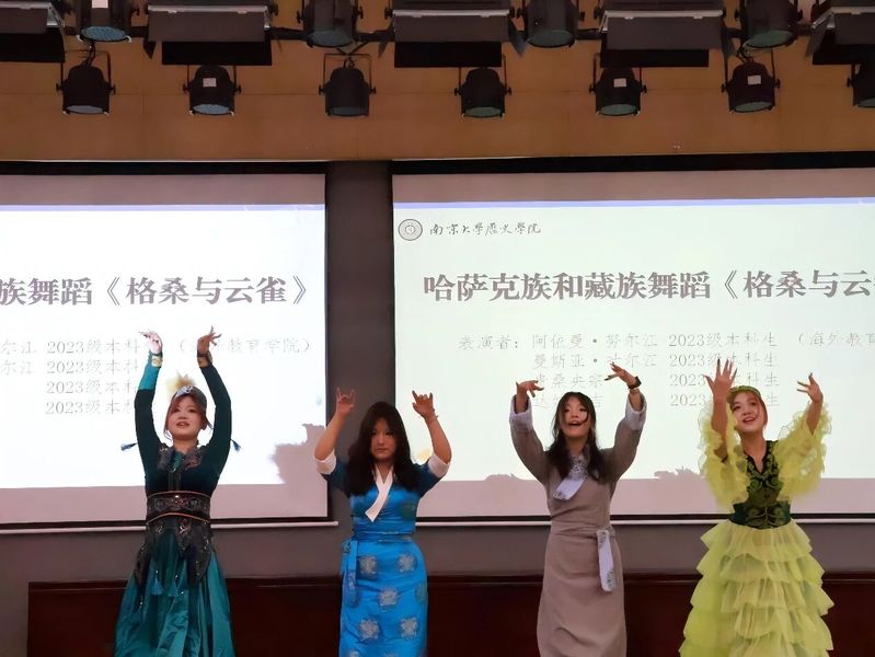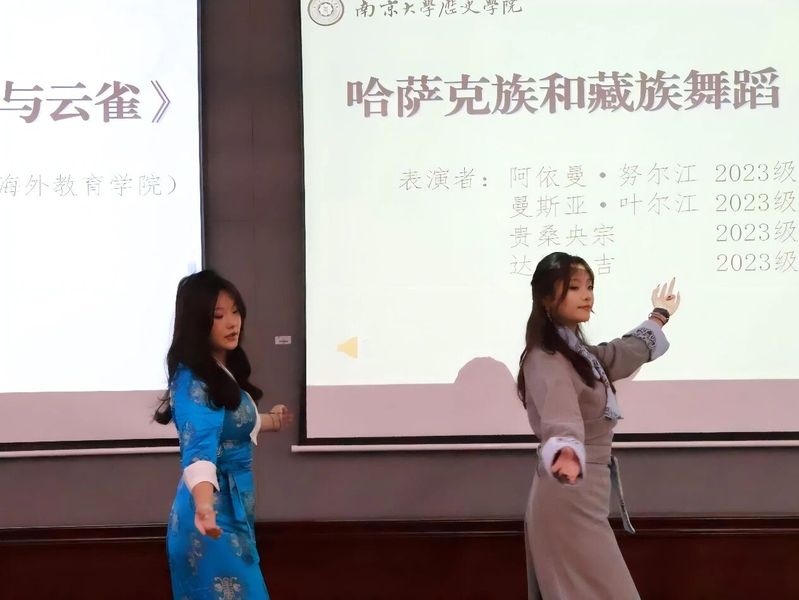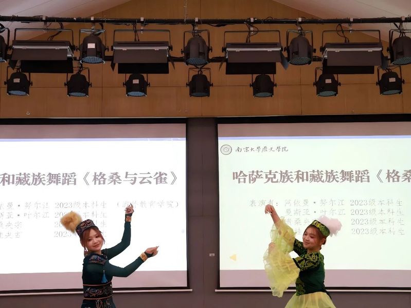 2023级本科生阿依曼.努尔江、曼斯亚.叶尔江、贵桑央宗、达娃央吉共同呈现民族舞蹈<<格桑与云雀>>,以灵动而富有民族韵律的舞姿,生动展现了民族文化交融下的青春风采,为典礼增添了鲜明而隽永的艺术亮色。