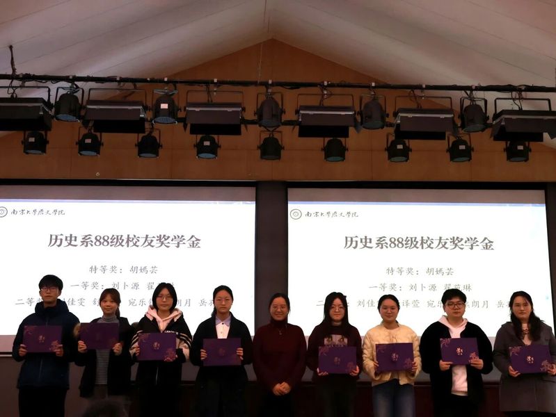胡嫣芸、刘卜源、翟苑林、刘佳雯、舒译萱、宛乐锦、熊朗月、岳孙可8名同学荣获本年度历史系88级校友奖学金。历史系88级校友奖学金宗旨为鼓励在校学生们勤奋学习、刻苦钻研、全面发展。澳洲幸运10官网 党委书记刘颖老师为获奖同学颁发证书。