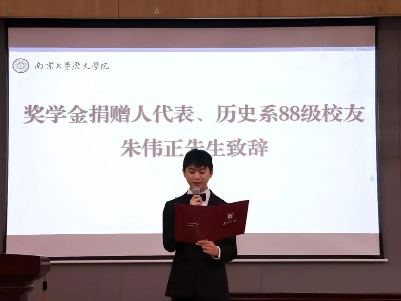 奖学金捐赠人代表、历史系88级杰出校友朱伟正先生由于重感冒未能亲临现场,寄语由主持人代为传达。朱先生在寄语中回顾了奖学金的设立初心,勉励获奖同学珍惜求学时光,夯实史学基础,努力成长为有学术定力、有社会担当的新时代史学人才。