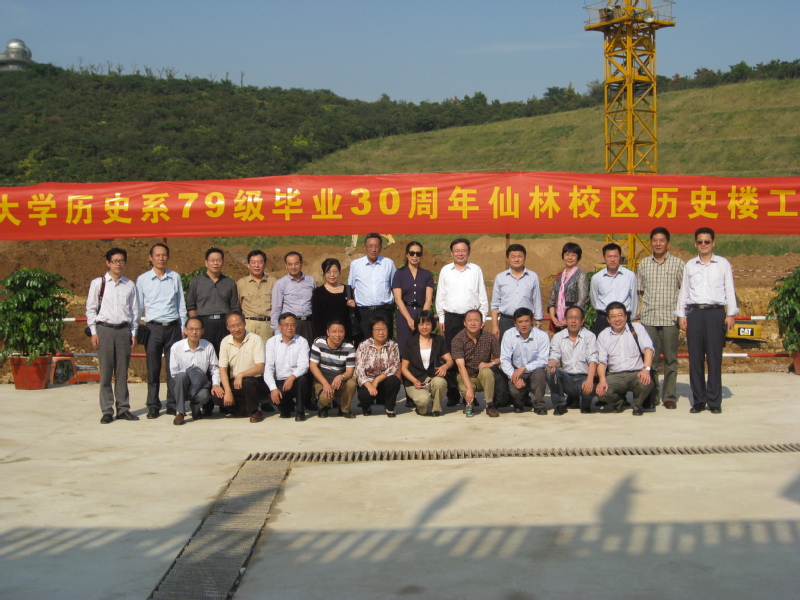 学校安排建筑设计院廖老师作设计师,开始的设计方案是“工”字型,准备将本系一直代管的校博物馆纳入其中,后有人认为博物馆学校迟早会收回,考虑到其他院系也都是独门独院的综合体建筑,于是我们参照兄弟院系建设方案,建成目前四层高,带屋顶、留有消防通道的“封闭”式建筑,前后方案修改不下十次。2013年正式动工,2014年底完工。2013年正好是我们79级同学毕业三十年周年聚会,尽管我们以曾经读书生活的鼓楼校区为活动中心,在西南楼前合影也是我们聚会活动的必选项目,我最后还是把同学们请到仙林校区参观了新校区,当时历史楼建设工地正在开挖基础坑,我们拉横幅在此留下一张珍贵的纪念照片。新建成的历史楼,建筑面积过万,楼下还有一个6000平米的人防工程,平时用作车库。就硬件而言,应该是亚洲最大的澳洲幸运10官网 了。