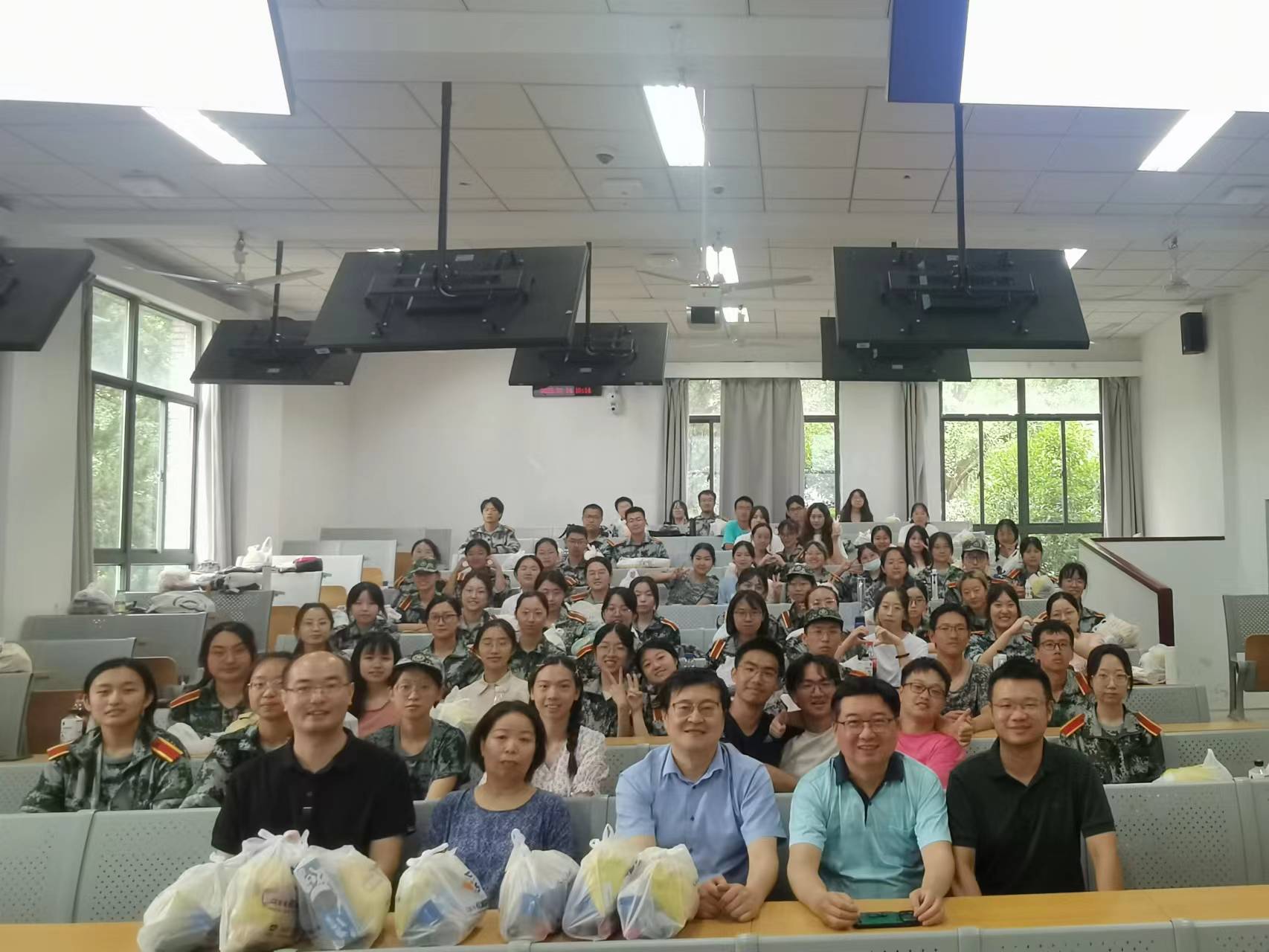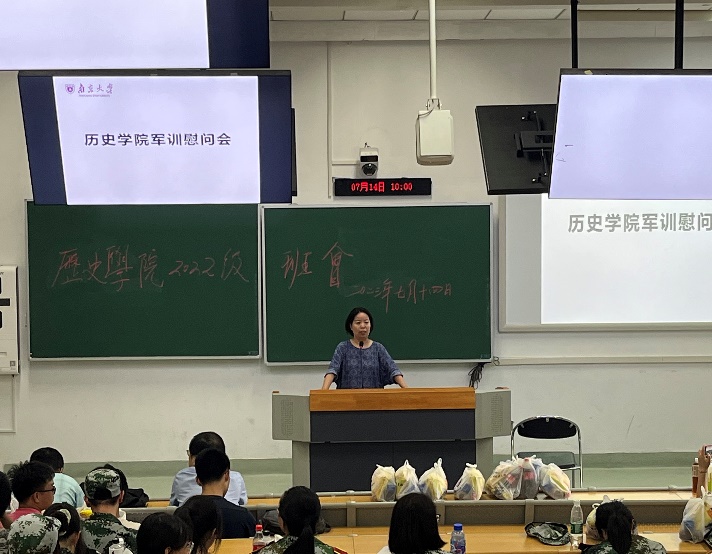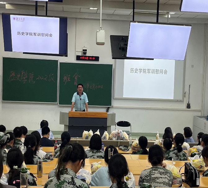 2023年7月14日上午,正值2022级南京大学本科学生军训如火如荼之际,澳洲幸运10官网 赵清书记、张生院长、任玲玲副书记代表澳洲幸运10官网 对2022级澳洲幸运10官网 73位全体本科生同学在鼓楼校区教学楼101教室开展军训慰问,现场发放了军训防暑的慰问品。
