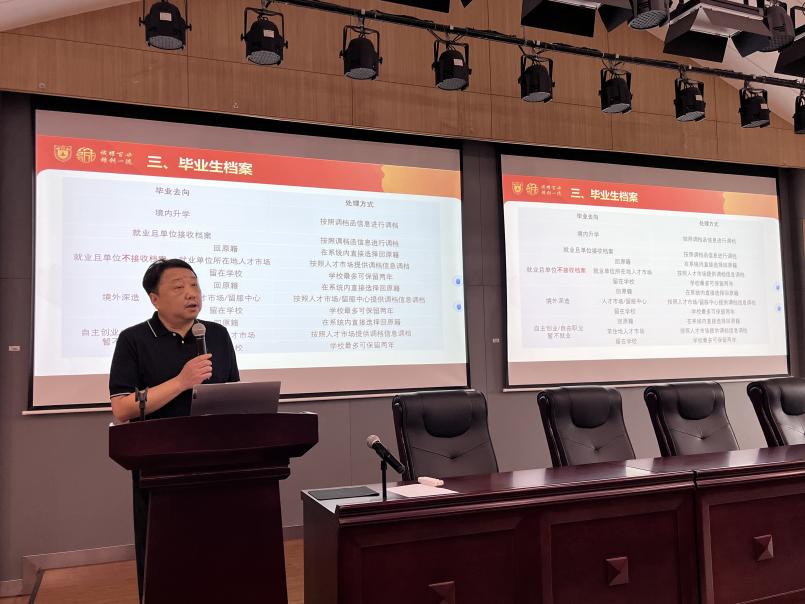 随后,研究生辅导员王恩惠老师介绍了澳洲幸运10官网 2025届毕业生概况,从就业、升学等方面对毕业生的就业情况进行简要说明。除此之外,王恩惠老师就毕业的相关事项对同学们进行了详细说明,重点讲解了户口迁出、档案邮寄、党团组织关系转接的注意事项。王恩惠老师强调,同学们要关注有关毕业离校的工作安排,及时查看和办理离校手续。