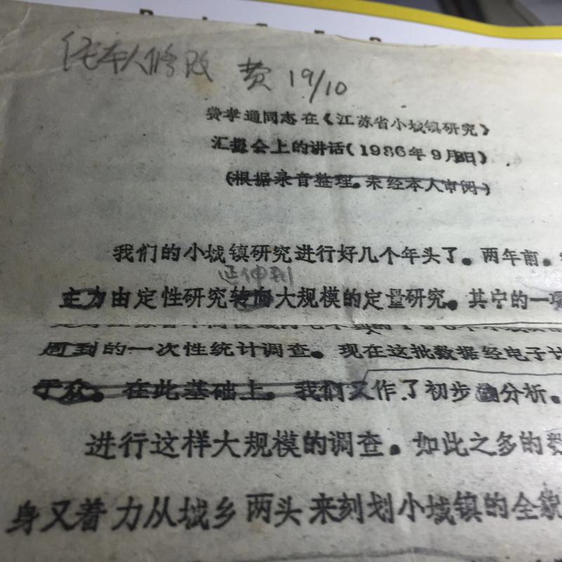 社会学研究所名誉所长,后来任全国人大常委会副委员长,老先生和蔼可亲,与我这个小年轻合影。也就是在这次会上,费孝通作了著名的《小城镇大问题》报告,会后,他将报告呈当时的中共中央总书记胡.耀邦,胡.耀邦阅后作了长篇批示,大意是说,对于小城镇,我们党内多数同志不熟悉,现在专家写了调查报告,要好好研究这个问题。这次会议之后,要出会议论文集,但对小城镇研究的成果非常少,于是省社科院的领导将我的大学毕业论文推荐给了费孝通,他看了以后,写了他的意见,“推荐入集”,还将我找去谈话,他说,明清时期苏松杭嘉湖地区的小城镇相当繁荣,后来衰落了,要将这个历史脉络理清楚。从此以后,我就参加费孝通先生主持的“六五”期间国家重点课题:“江苏小城镇研究”和“七五”期间国家重点课题:“城乡关系研究”,跟随他调查研究十余年,在调研的路上、在饭桌上一起讨论问题,早上常常陪他散步,陪他考察农贸市场。应当说他非常喜欢我,常常叫我“小邹”,多次来江苏调研之前,要关照省里负责接待的领导,将社科院的小邹叫上,有几次,他在台上作报告,我在台下记录,然后整理成文后交他审阅定稿。他是苏州吴江人,我是无锡人,老家都讲吴侬软语,他讲话有浓重的乡音,在实地调查过程中,有的人会听不懂,他就讲,叫小邹翻译。我写的文章他亲自给我修改。多少次调查问题,他说,这次做什么专题不定,你们自己去实地考察,就会发现问题,调查一段时间后,集体汇报,他说这是“考试”,汇报时,先是我们讲,然后他一一点评。就是经过这样的训练,我自己逐渐学会了写文章,这一个时期,也是我学术成果比较丰富的一个阶段,每年要在《社会学研究》上发几篇文章。我后来专题研究农村问题、小康社会、城市化、社会结构变迁、基层社会治理、现代化等专题,与受费孝通的指导有极大的关系。老先生当面给我讲过很多话,现在能够记得的,比如,他讲,社会科学要学以致用,胡乔木同志叫我重建中国社会学,如果我关在书斋里,翻译翻译英文的学术成果,介绍介绍结构功能主义理论、冲突理论这样的文章,那三天可以写一篇,成果会十分丰硕,但那个东西中国社会不需要,中国社会要的是解决实际问题的学问,老先生一辈子做的是志在富民的学问。又比如,他十分看重现场第一手资料,做小城镇研究时,有一些人认为,现在收集资料的手段那么多,何必还到现场去实地考察呢,在北京发发问卷就能解决问题,他坚决反对,坚持做实地调查工作,晚年九十岁出头了,还出京做社会调查。