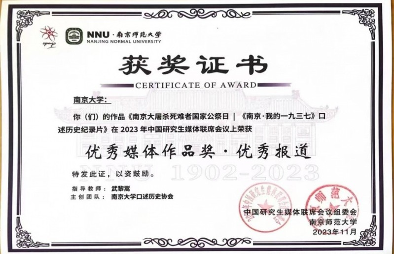近日,2023年中国研究生媒体联席会议在南京闭幕,由南京大学口述历史协会完成的《南京大屠杀死难者国家公祭日|〈南京·我的一九三七〉口述历史纪录片》报道荣获优秀媒体作品奖·优秀报道。