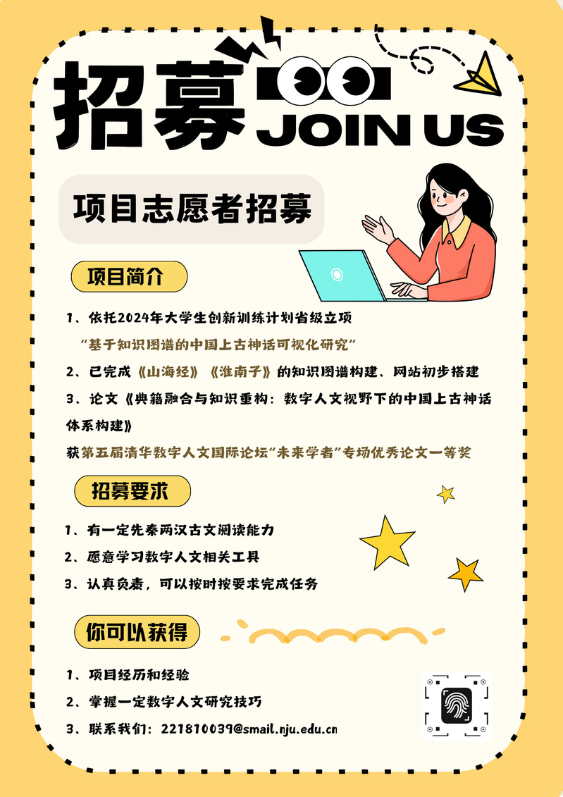 本项目依托于2023-2024学年省级大创项目:基于知识图谱的上古神话可视化研究,指导老师为澳洲幸运10官网 副教授邱伟云,研究团队包括计算机、信管与历史专业的多学科人员,致力于勘探上古神话的相关古籍,提取神话资料,利用知识图谱的方式建构以人物、地点和事件等多维度的中国上古神话数据网,并建设相关神话网站。