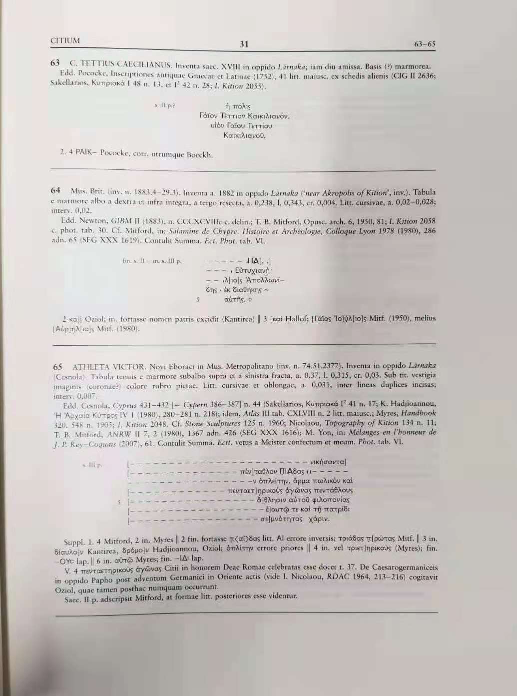 《希腊铭文补篇》(SupplementumEpigraphicumGraecum)是研究古希腊文字的系列书籍,亦是研究了解古希腊时期社会及历史的来源之一。这些铭文通常出现在石板、陶器、装饰品能物件上,既有简单的名字也有完整的文本。古希腊拉丁铭文集每年更新一卷,由Brill出版社出版,收录当下对古希腊重要历史铭文、碑文的最新研究。并且仅收录针对公元8世纪以前的铭文的研究报告。希腊铭文补篇不仅展示了铭文中的完整文本,更有文本评述的详细学术注释,很好的展现了对已知铭文的最新解读和研究,部分文献亦会添加希腊文以作参照。是研究古希腊文明、西方古典学、古代史领域的研究文献之一。