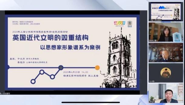 On the occasion of the 26th World Book Day on 23 April 2023, Professor Yu Wenjie was invited by Shanghai Yangpu District Library and Shanghai People's Publishing House to give a lecture entitled "The Double Structure of Modern British Civilisation". More than 570 readers from Shanghai and home and abroad attended the lecture. Researcher Li Guanjie of the Centre for British Studies at Shanghai International Studies University chaired the lecture and engaged in a dialogue on related issues.